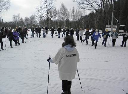 Po powitaniu gości przez dyrektora Centurm Kultury w Tłuszczu pana Henryka Wysockiego odbyła się rozgrzewka - przeprowadziłyśmy ją ja i Krysia Gostyńska - i ruszyliśmy traktem leśnym. Uczestnicy założyli sobie wcześniej na czapki maski karnawałowe, co bardzo ożywiło wygląd grupy i ducha.